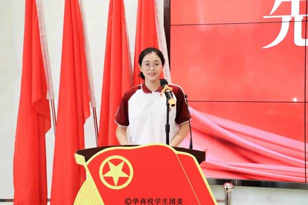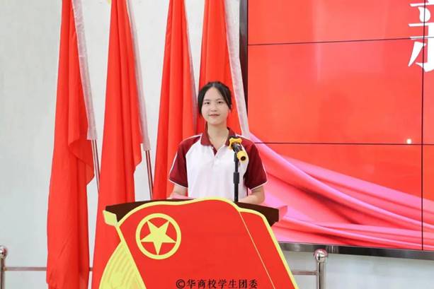 由 20 级工商管理 2 班的曾楚彤同学代表新团员发言。她首先代表 2020 - 2021学年新团员对校党委、团委领导一直以来的的关怀和培养表示衷心地感谢。接着与新团员们一起回顾过去一个月的团课的学习成果,并向新团员提出三点建议: