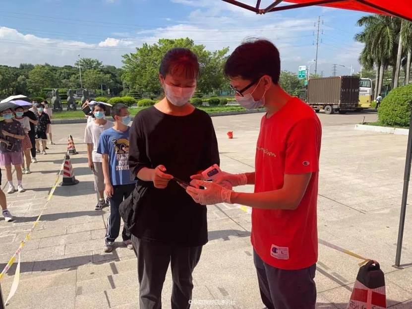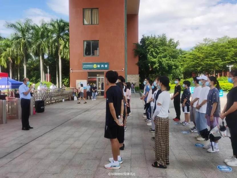 准备入校的同学们按要求排好队,佩戴好口罩,工作人员对其进行行李消毒、测温、手部酒精消毒,并按要求扫码。绿码、体温正常、48小时核酸检测阴性、无其他症状者,方可进入。