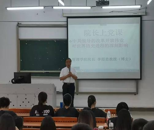 为响应“关于做好2022年春季第二学期学院党组织书记、院长上第一堂思政课”的号召,深入贯彻中办、国办印发的《关于深化新时代学校思想政治理论课改革创新的若干意见》精神,3月21日下午,管理学院院长李招忠教授于励志楼C401为我院学生开展了以“中共领导的改革开放伟业对世界历史进程的深刻影响”为主题的思想政治教育专题课。