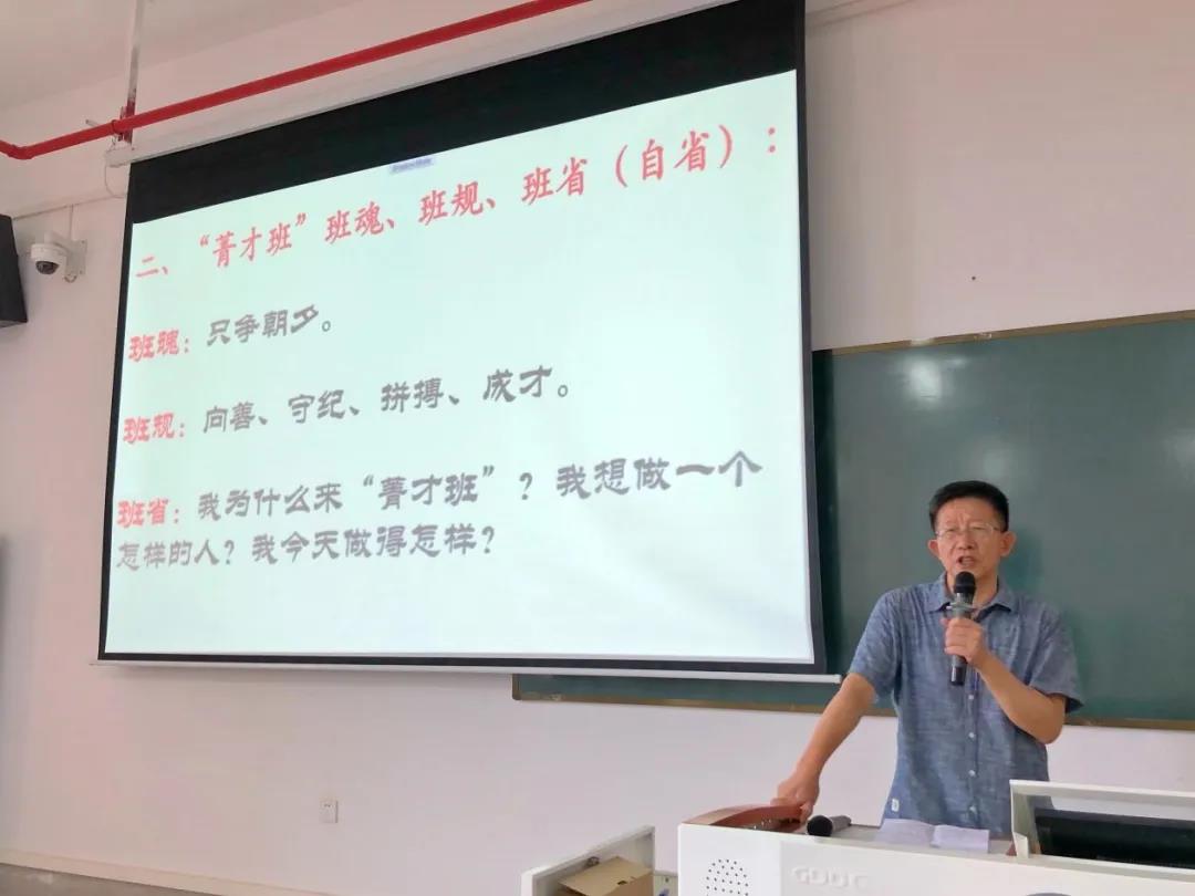 在开班仪式上,文学院副院长蒋家国教授指出,“菁才班”是培养中国特色社会主义事业所需要的、全面发展的复合型高素质人才的实验班。开设“菁才班”是文学院深化教学改革的新事物,必须一步一个脚印地探索前行。并提出要塑造“只争朝夕”的“班魂”,建立“向善、守纪、拼搏、成才”的“班规”,并从曾子“吾日三省吾身”的典故引导出“菁才班”的三条“班省”。