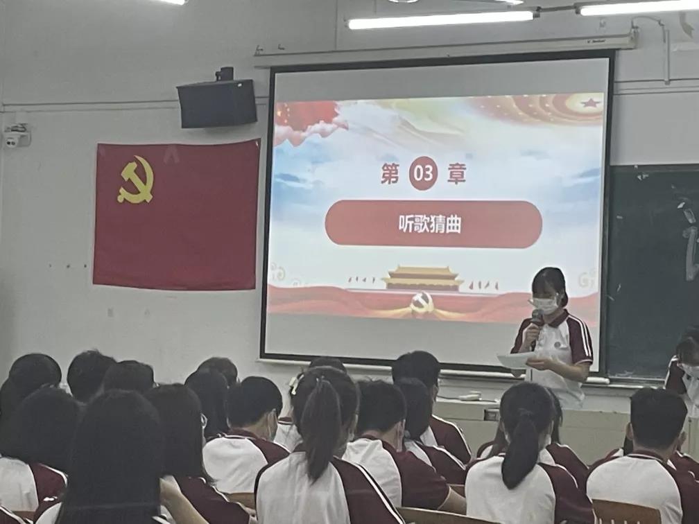 主持人首先给同学们播放经典红色歌曲,让同志们听歌猜歌名,知道歌名的同志可以举手抢答,同志们通过红色歌曲领会到中国共产党的光辉历程。
