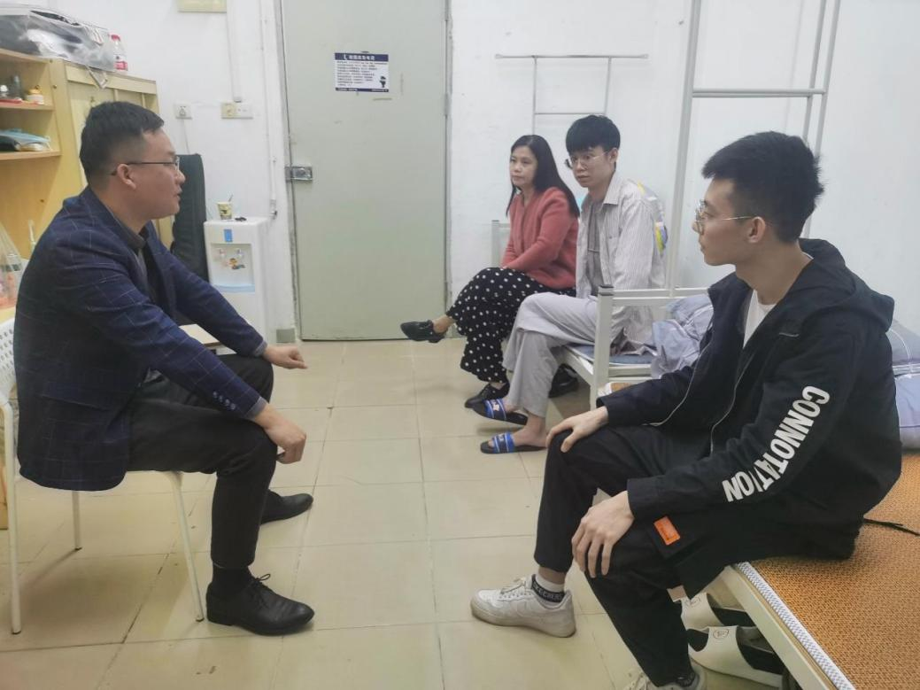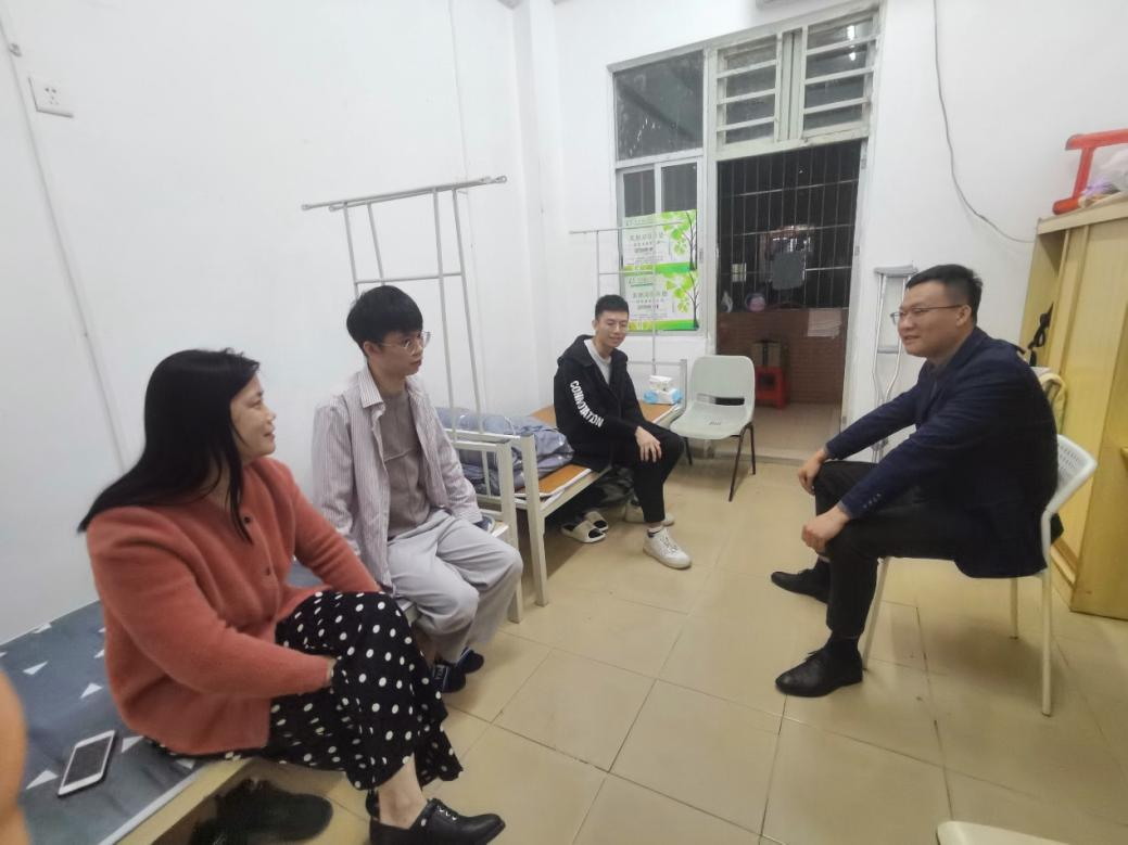 在杨森源同学的宿舍里,会计学院党委负责人陈洋广老师仔细询问了他的伤情和身体状况,关切地叮嘱他安心养伤;并从学习、生活和工作等多方面了解和关心杨森源同学。